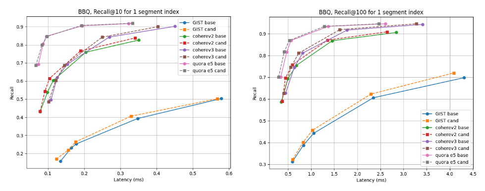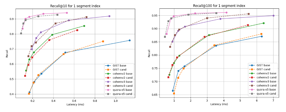 As you can see, for multiple segment indices the candidate is better for the Cohere v3 dataset and slightly worse, but almost comparable, for all other datasets. After merging to a single segment recall curves are almost identical for all cases.