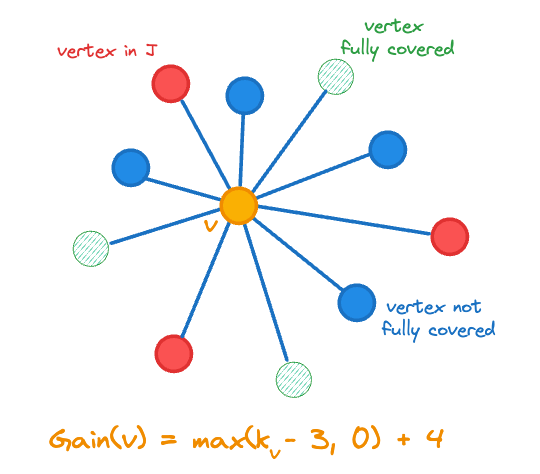 Here, denotes the count of neighbors of a vector in and is the indicator function. The gain includes the change in the count of the vertex we added to , i.e. , since we get closer to our goal by adding a less covered vertex. The gain calculation is illustrated in the figure below for the central orange vertex.