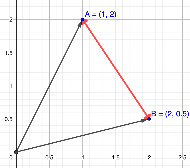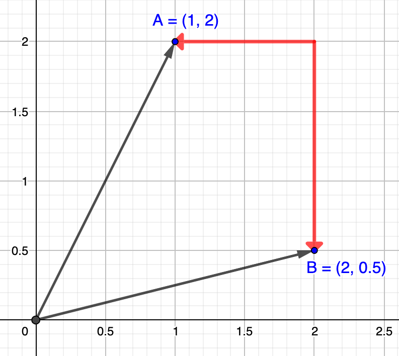 Let’s reuse the same two sample vectors and as we used for the distance, and we can now compute the distance as .