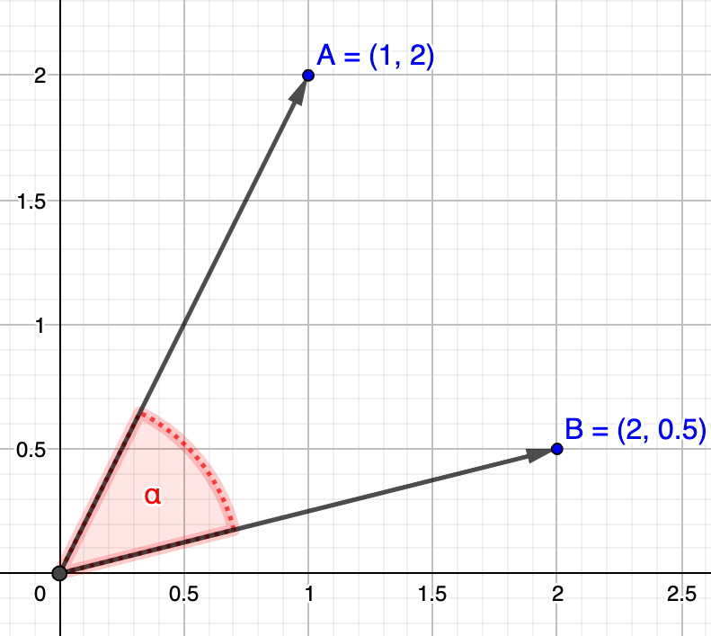 In contrast to L1 and L2, cosine similarity does not measure the distance between two vectors and , but rather their relative angle, i.e., whether they are both pointing in roughly the same direction. The higher the similarity , the smaller the angle between the two vectors, and hence, the "closer" they are and the "similar" their conveyed meaning are.
