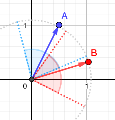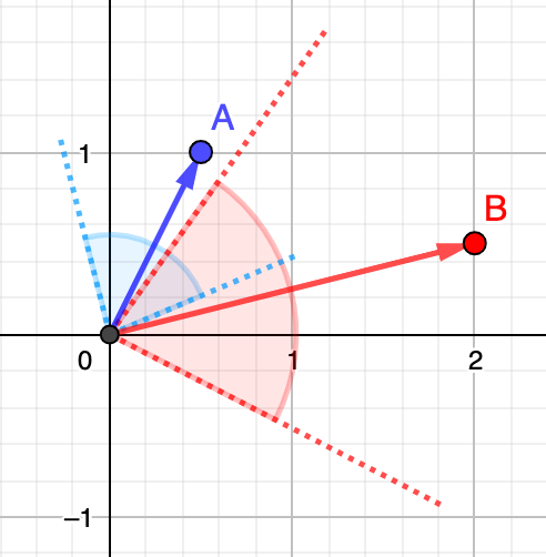 To illustrate this, let's think of two people out in the wild looking in different directions. In the figure below, the person in blue looks in the direction symbolized by vector and the person in red in the direction of vector . The more they will direct their eyesight towards the same direction (i.e., the closer their vectors get), the more their field of view symbolized by the blue and red areas will overlap. How much their field of view overlap is their cosine similarity. However, note that person B looks farther away than person A (i.e., vector is longer). Person B might be looking at a mountain far away on the horizon, while person A could be looking at a nearby tree. For cosine similarity, that doesn't play any role as it is only about the angle.
