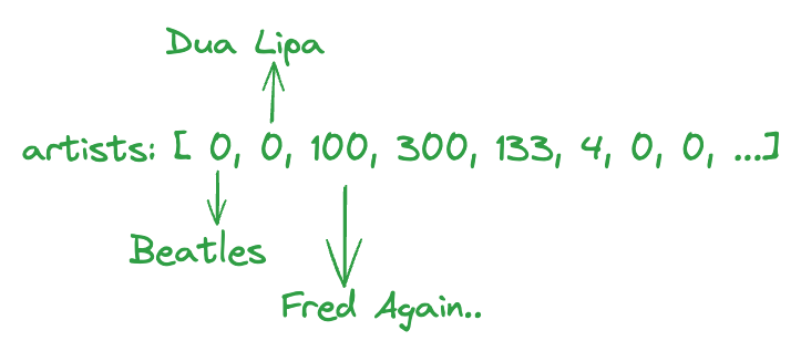 We tried squeezing our vector where each position represented an artist into a dense_vector field, however it's not the best fit as you can tell. We are limited to 4096 artists and we end up with a large array that has a lot of null values. Philipp might never listen to Pink Floyd yet in the dense vector approach, Pink Floyd will take up one position with a 0. Essentially, we were using a dense vector format for data that is inherently sparse. Fortunately, Elasticsearch supports sparse vector representation through the sparse_vector type. Let’s explore how it works!