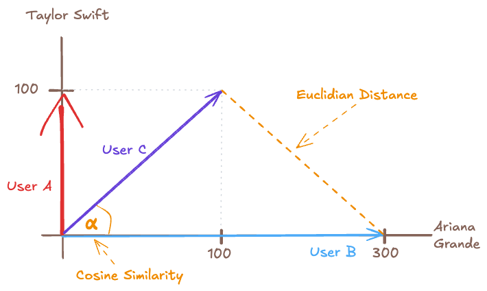 We will not delve into the mathematical details of each method, but we will provide a brief overview of how they work. To simplify, let’s break this down into just two dimensions: Ariana Grande and Taylor Swift. User A listens to 100 songs by Taylor Swift, user B listens to 300 songs by Ariana Grande, and user C falls in the middle, listening to 100 songs by Taylor Swift and 100 songs by Ariana Grande.