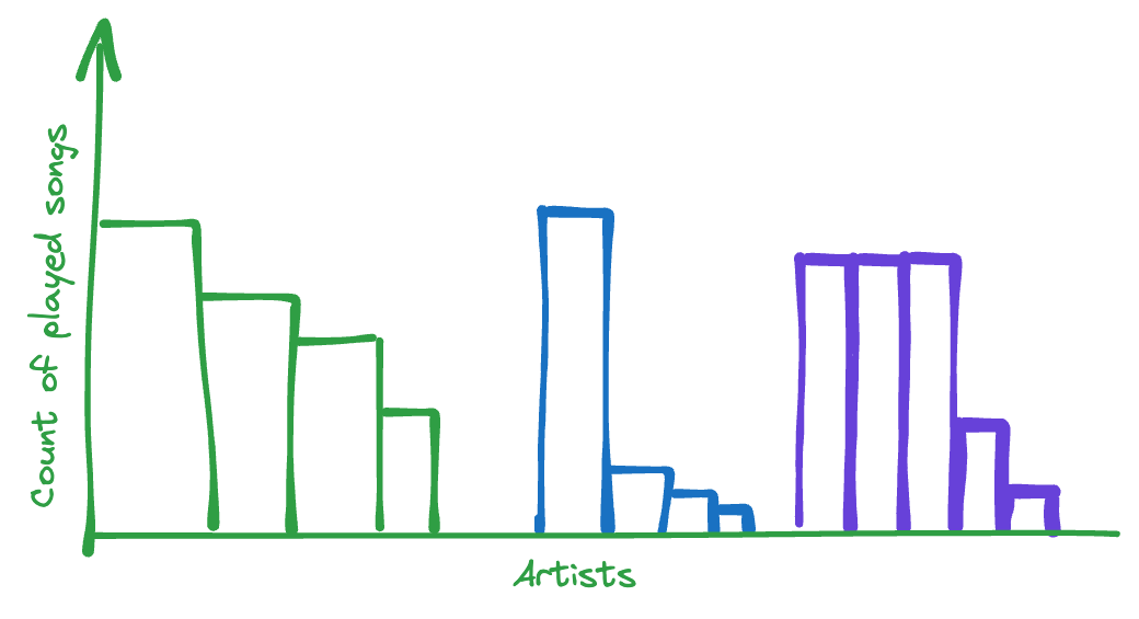 The idea is to simply create a huge array where we do a key => value sorting approach. The key is the artist and the value is the count of listened to songs. This is a very simple approach and can be done with a few lines of code. We create this vector: